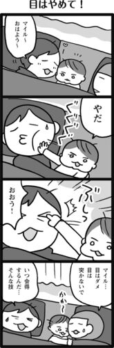 容赦なく、目を狙います。絵もそうなってますけど、これをやってるときの息子の顔はちょっと楽しそうです…。あと、アゴを押し返すときのポイントも結構いいとこ抑えていて「うちの息子はセンスあるな(空手的な目線)」と思ってしまう…(空手脳)。マンガに…