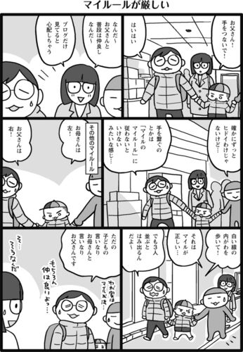 いつだってお父さんは虐げられているわけではないです。 お迎えに行けば仲良く帰ってくるし、3人で歩けばどっちとも手を繋ぐ。でも、それが全て「仲良し」かどうかは、ちょっとわからない…みたいな。息子はめっちゃ細かい男なんです。3人で歩いてて、手を…