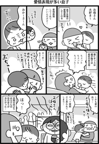正直いって、ファミレスで母親に熱烈キッスしてくる3歳児…。大丈夫か?! と思わなくも無い。っていうか、なんか「あそこのおうちは愛情不足なのかしら」と思われるんじゃないか…息子が母親の気を引くために一生懸命で…とか思われそう。んが、皆様このマン…