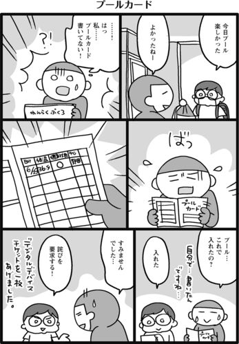 はじめてのプール授業の日。すみません、書き忘れました。えーとですね、平熱書いたり連作先書いたりそういうのはしてあったんです。 で、体温とサインだけ書かなきゃいけなかったんだけど忘れました。体温は毎朝書いて別の書類にも書いてるので、嘘はなく。…