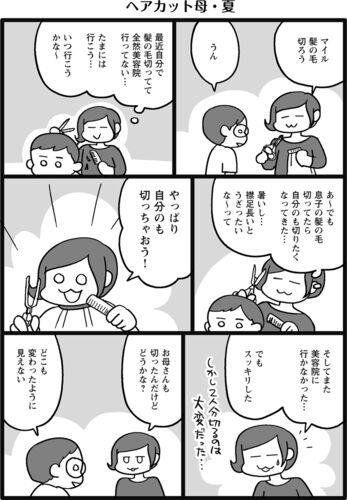 私的にはどんどん短くなっているんですけど、家族的には「いや、別に?」みたいな感じっぽい。でもまあ、以前は「美容院行くまで…」となんとなく伸びてたのが、こまめに切ってるって考えれば、これくらいが「通常」なのかもしれない。息子の髪の毛も結構短く…